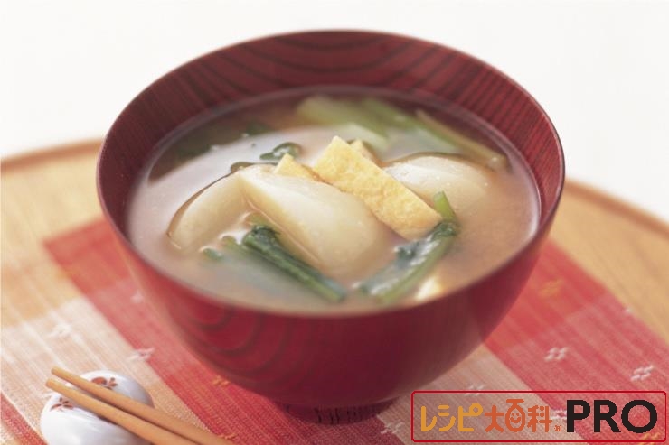 かぶの葉はそのまま青菜として。油揚げのコクと相性のよいお味噌汁
