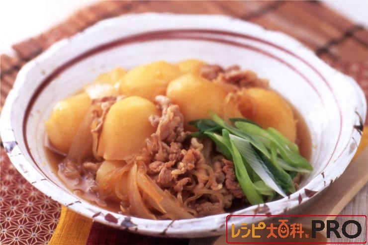 鍋に油を熱し、じゃがいもを表面が透き通るまで炒め、Aを加えて煮立てる。豚肉を広げ入れ、アクを取る。