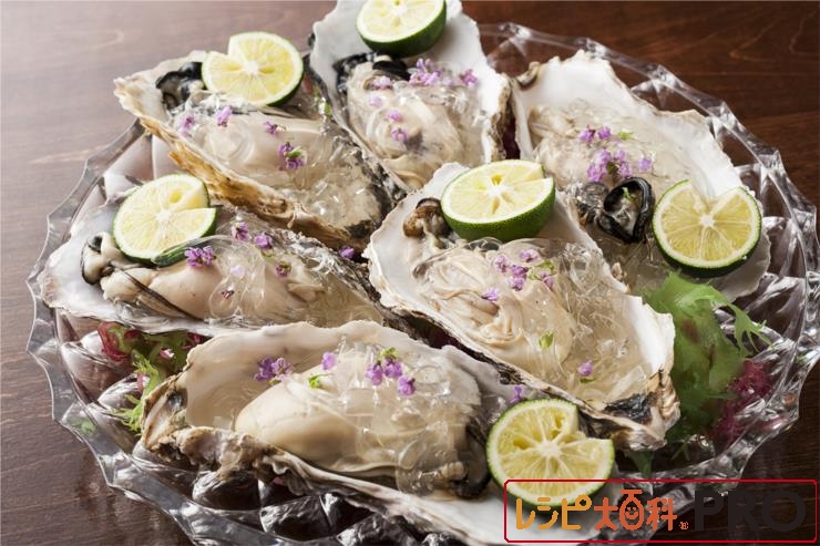 かきの殻に(4)を1粒ずつ盛り、上から(3)をかけ、すだちを添え、花穂じそを飾る。