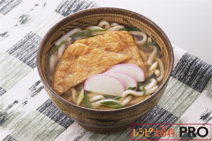器を熱湯で温め、ゆでたうどん、わけぎ、汁気をきった(1)の油揚げを盛り、かまぼこを添え、アツアツの(2)をかける。