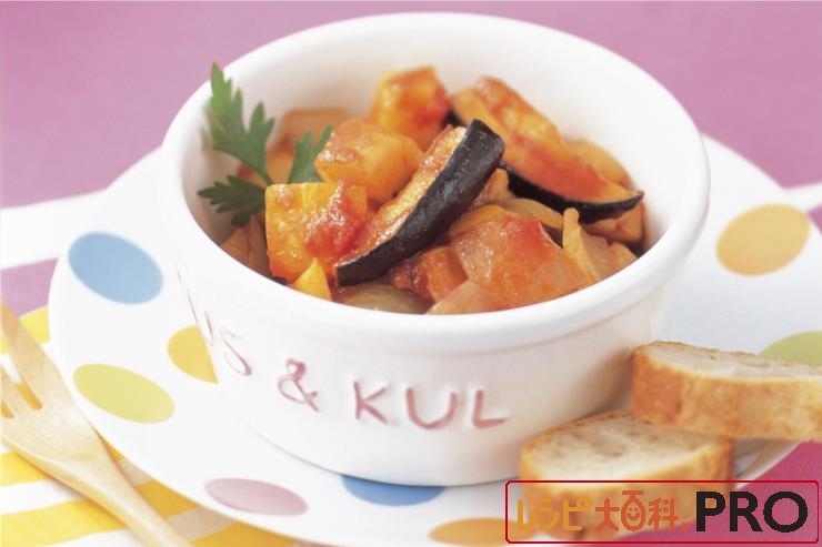 鍋にオリーブオイルを熱し、にんにく、なすを炒め、