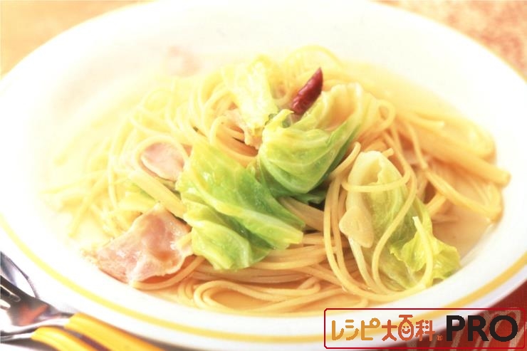 キャベツ、「コンソメ」、ゆで汁を加えてサッと煮る。さらに(1)のスパゲッティを加えて煮て、Bで調味する。