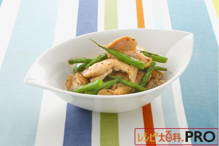 フライパンにオリーブオイルを熱し、鶏肉を入れ、約2分焼く。さやいんげんを加え、鶏肉と一緒にさらに3~4分焼く。