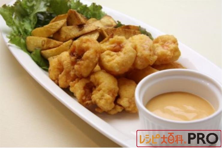 むきえびにAで下味をして、Bのバッターをつけて揚げ、フライドポテトも揚げる。