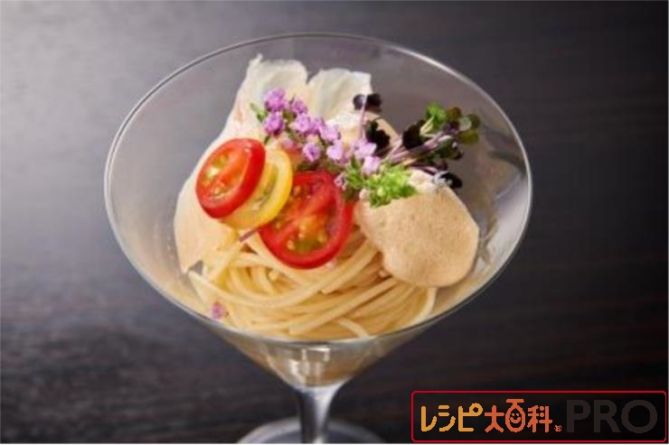 グラスに(1)を(2)のソースとからめて盛りつけ、