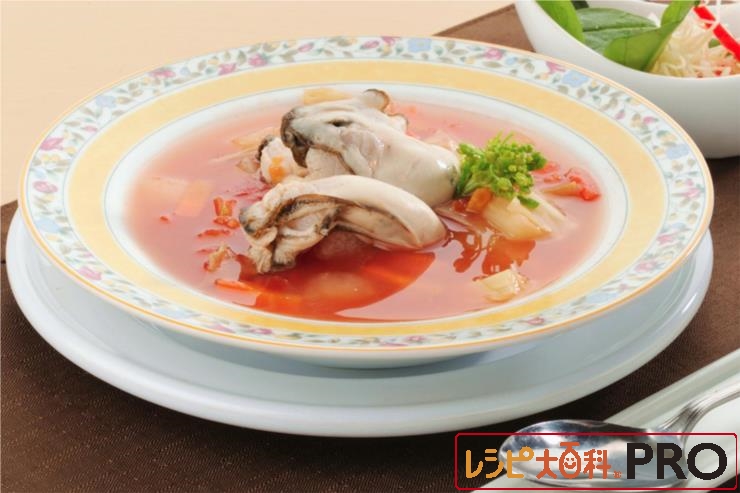 トマトベースのスープにぷっくりとしたカキを浮かべて。