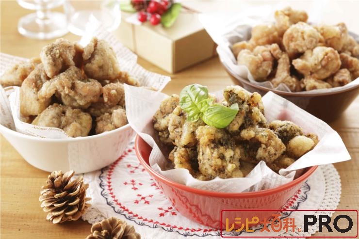 「丸鶏がらスープ」をもみ込み、にんにくをまぶす。混ぜ合わせたBをまぶし、180℃の油で揚げる。
