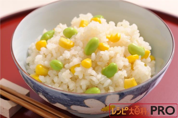 炊飯器に洗った米、Aを入れ、とうもろこしを加えて炊く。