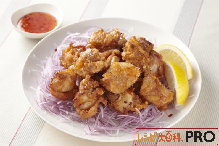 (1)に片栗粉をまぶし、180℃の揚げ油で揚げる。