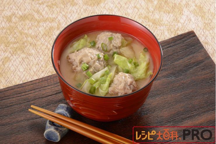 鍋にBを入れて火にかけ、沸騰したら、みそ半量を溶き入れ、白菜の芯、(1)のだんごを加える。
