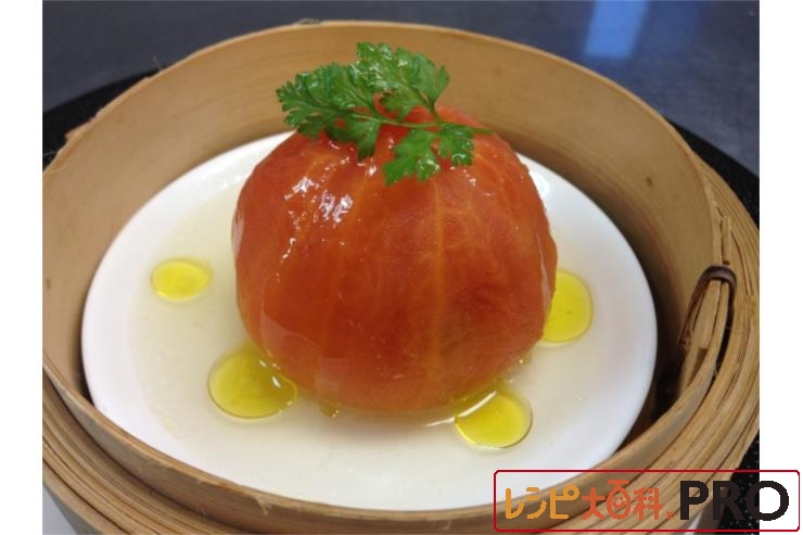 トマトは中をくり抜き、丸鶏使用がらスープをまんべんなくまぶしてマリネする。