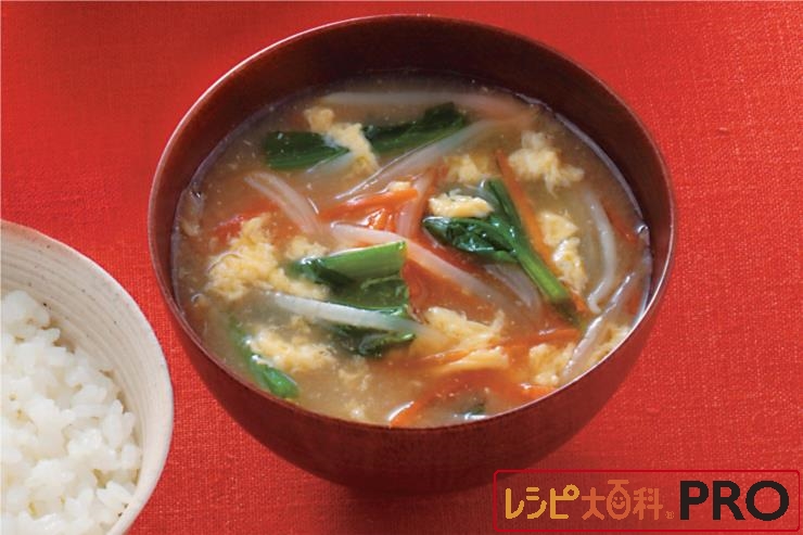 火が通ったら、みそを溶き入れ、溶き卵を回し入れてひと煮立ちさせ、器に盛り、ごまをふる。
