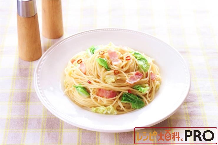 フライパンにオリーブオイル、にんにくを入れて弱火で熱し、香りが出たら赤唐がらし、ベーコンを加えて炒める。
