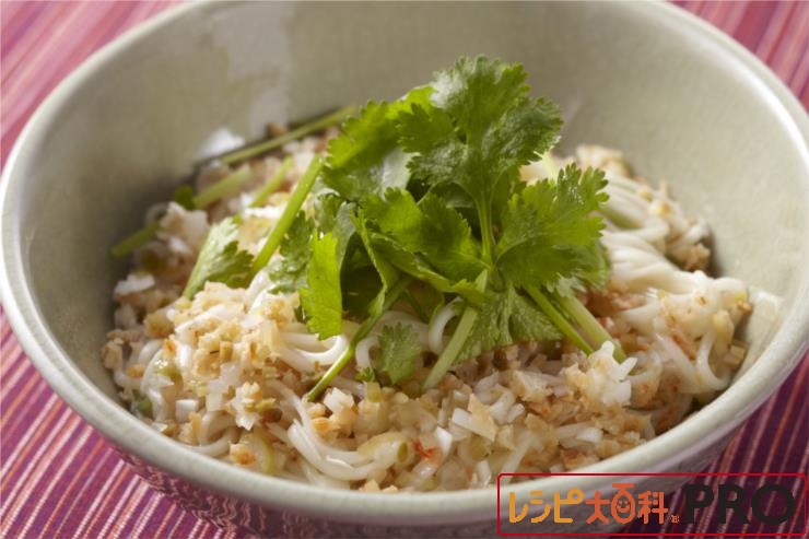 (4)に残りのC、干しえびを散らし、香菜をのせる。