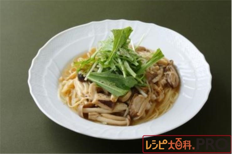 カッペリーニを(2)に加えて味をなじませ、水溶きコーンスターチで軽く濃度をつける。
