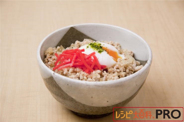 (1)に鶏ひき肉を加えて煮、Cを入れて味を調える。