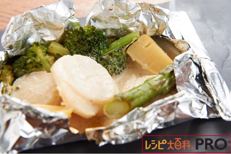 (1)にBを合わせてアルミホイルに包み、ゆずの皮をふって220℃のオーブンで5~6分焼く。