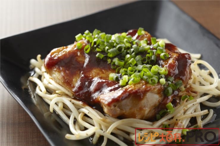 (2)のもやしの上に鶏肉をのせ、フライパンに残ったソースをかけ、小ねぎを散らす。