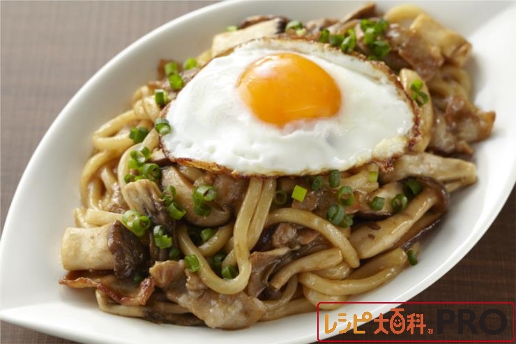 (1)に残りのサラダ油を入れ、Aを炒め、ゆでうどんを加えて炒め合わせる。