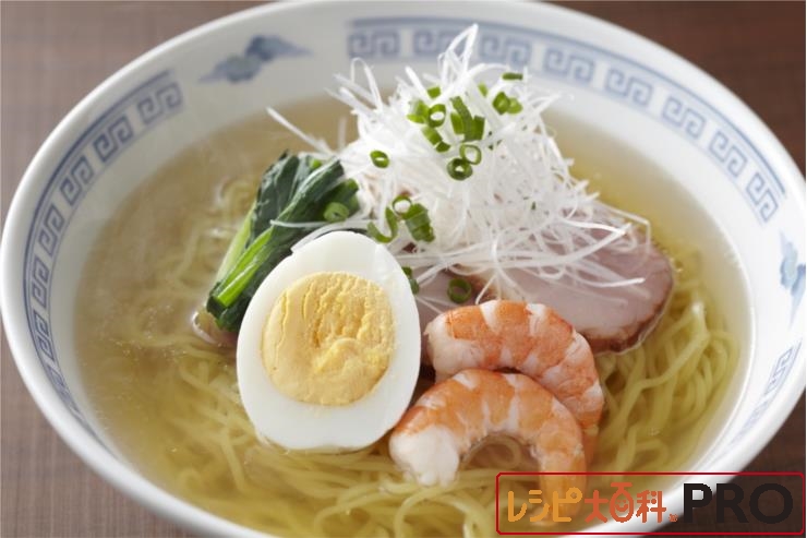 器に(1)を注ぎ、中華めんを入れ、Aを盛りつけ、Cをのせる。