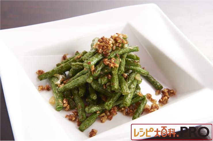 さやいんげんは200℃の油できつね色になるまで揚げる。