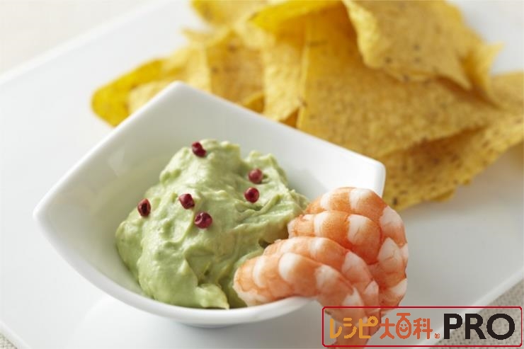 器に(1)を70g盛り、ピンクペッパーを散らし、えびを添え、トルティーヤチップスとともに提供する。