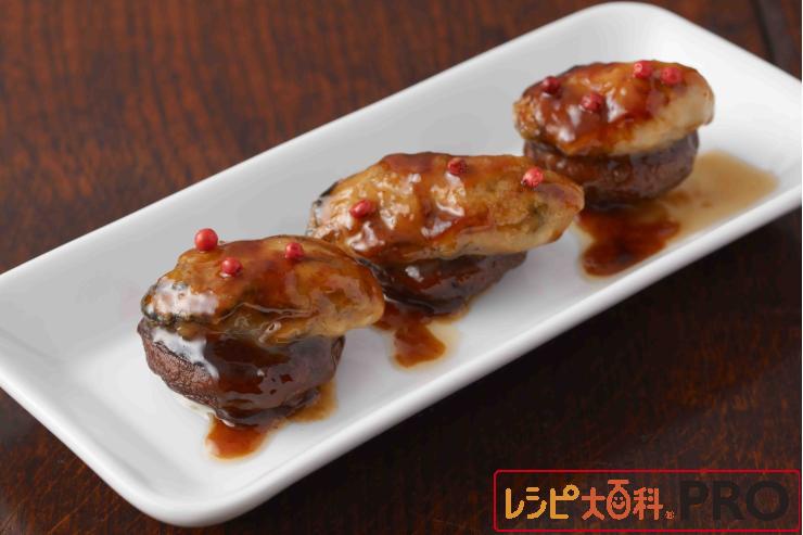 フライパンに残ったかきに、「Cook Do®」ガリバタ鶏用を加えてひと煮立ちさせ、かきを(2)のしいたけの上にのせて、フライパンに残ったソースをかけ、ピンクペッパーを散らす。