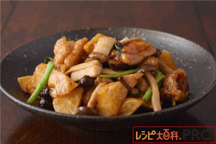 鶏肉とじゃがいも、きのこのガリバタ炒め