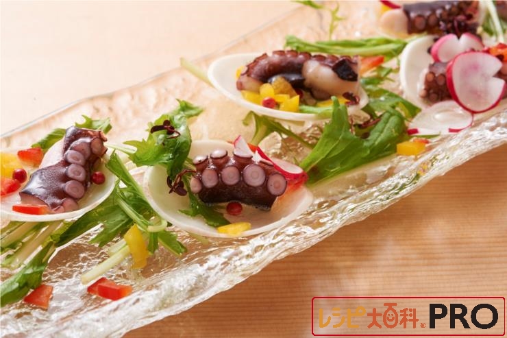 器に(3)のかぶを盛り、かぶの上に(2)のたこをのせてBを彩りよく散らし、「セミセパ®」レモンドレッシングをかける。