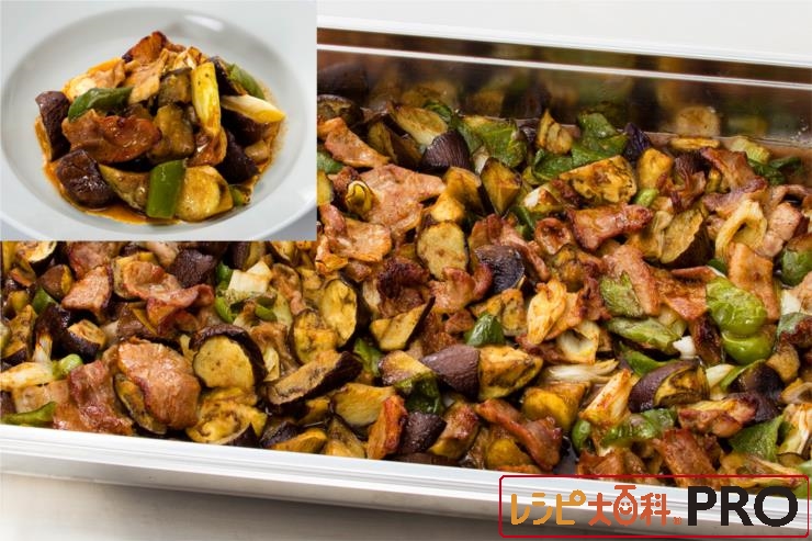 20mmホテルパンに、スチコン用クッキングシートを敷き、豚肉を広げ、スチコンコンビモード180℃湿度100%で7分加熱調理する。