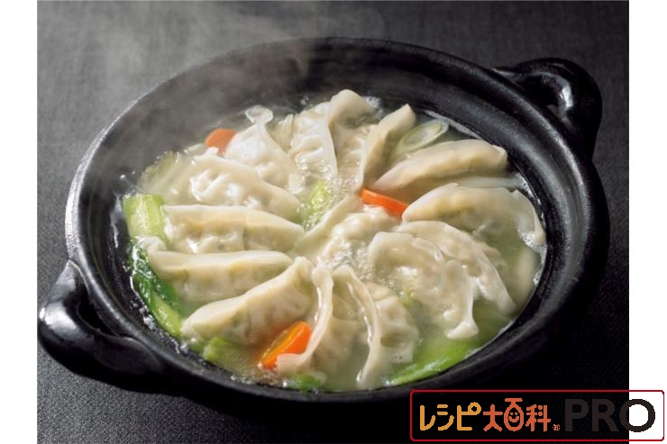 土鍋に水、「丸鶏がらスープ」を煮立てて、Aの野菜、餃子を加え、火が通るまで煮る。