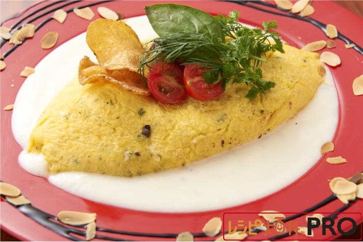 皿に(1)を盛り、周りに(2)のソースを流す。オムレツにCを飾り、皿のフチにDを飾る。