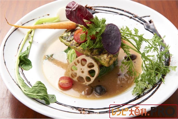 (4)の周りに(2)のスープを流し、れんこん、Cをあしらい、皿のフチにバルサミコ酢を流す。