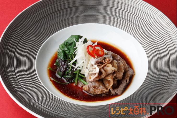 提供前に(2)を鉄鍋に移し、軽く火を入れる。