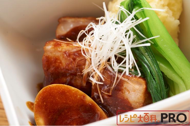 器に豚の角煮を120gずつ盛り、(3)の煮卵、Bを等分に添える。