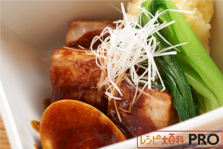 器に豚の角煮を120gずつ盛り、(3)の煮卵、Bを等分に添える。
