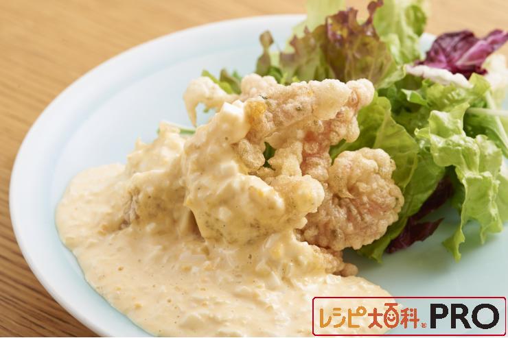 皿に(1)を盛り、(2)の和風タルタルソースをかけ、サラダ菜ミックスを添える。