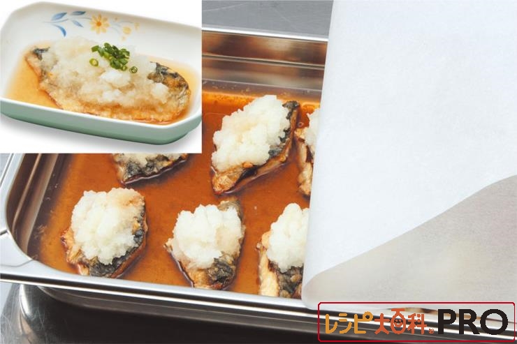 鯖の上におろし大根をのせ「クックパーEG ®スチコン用」をかぶせてフタをし、おろし大根が温まるまで。150℃のコンビモードで3分間加熱する。