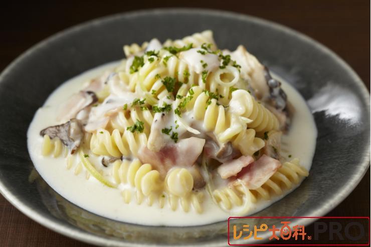 Cでパスタをゆで、(4)に加えてソースをからめ、