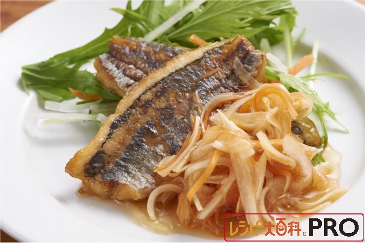 (2)の油をきってすぐに(1)にくぐらせ、(1)の野菜とともに皿に盛る。