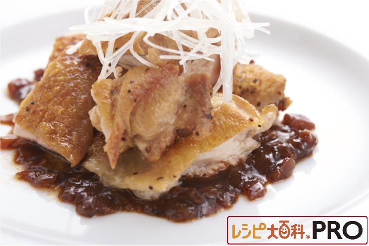 皿に(2)のソースを敷いて(1)の鶏肉を並べ、白髪ねぎをトッピングする。