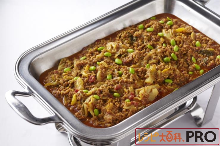 (4)に鶏ひき肉を入れて炒め、キャベツ、カレー粉を入れて炒める。