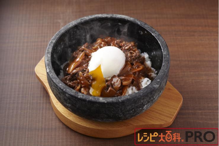 石焼きの器を熱してご飯を盛りつけ、ハヤシソースをかけ、温泉卵をのせる。