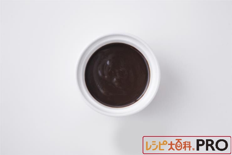 鍋に(1)のデミグラスソース100g、煮つめたバルサミコ酢を入れて混ぜる。