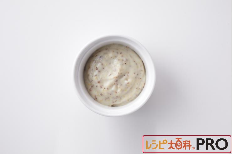 ボウルに(1)のホワイトソース100g、粒マスタードを入れて混ぜる。