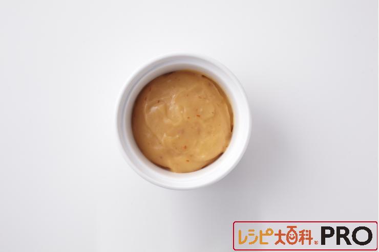 ボウルに(1)のホワイトソース100g、豆板醤を入れて混ぜる。