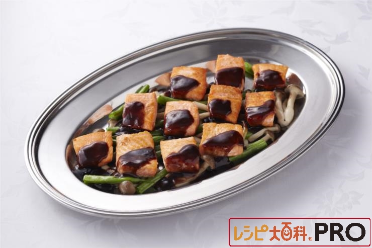 器に(5)、(6)を盛りつけ、(2)をかける。