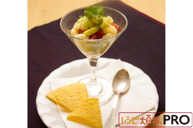 カクテルグラスに(3)を盛り付け、パクチーをかざる。