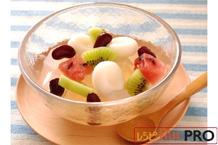 (1)を1cm角に切って器に入れ、(2)、Bをのせ、Cを混ぜたシロップをかける。