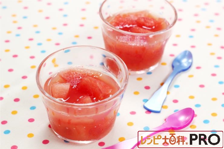 (2)のグラスに(3)を等分に注ぎ、冷蔵庫で冷